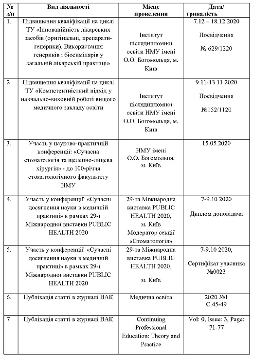 1. Науковий керівник переможця International online Olympiad of medical students “Samarcand-2020. Diploma in nomination Scintific approach in surgical Dentistry problem solution № D 00092