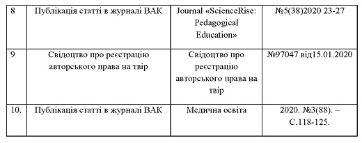 4. Reva TD, Nizhenkovska IV, Stuchynska NV,  Chkhalo OM. The state and prospects of development of national higher pharmaseutical education. Medicni perspektivi (Medical perspectives). № 2. Vol 25. 2020. Рр. 19-25. – https://doi.org/10.26641/2307-0404.2020.2.206336 Web of Science