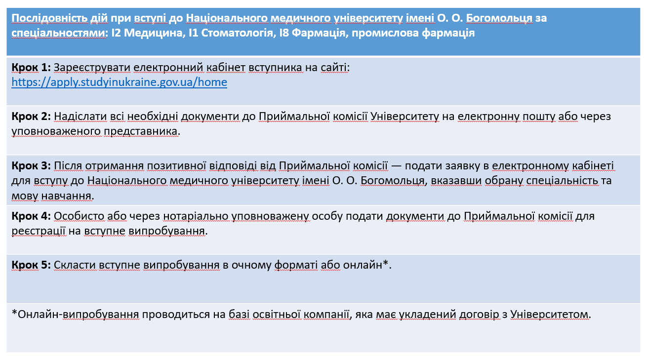Відповідно до Правил прийому на навчання для здобуття вищої освіти у Національному медичному університеті імені О.О. Богомольця, прийом заяв та зарахування іноземних громадян на 1-й курс триватиме з 19 липня 2025 року по 31 жовтня 2025 року.